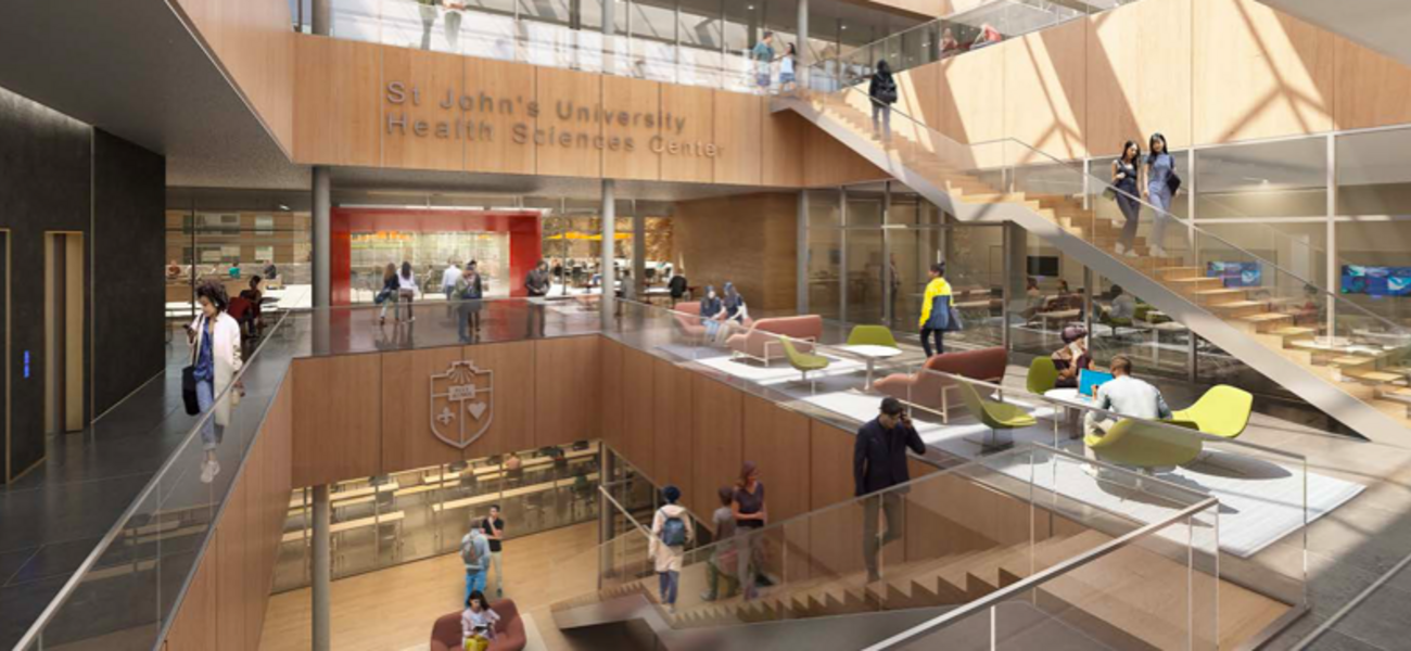 St. John's University broke ground on the $106 million Health Sciences Center in New York in May of 2022. Located on the Queens campus, the 70,000-sf facility will provide state-of-the-art laboratories, active learning classrooms, and simulation suites to train the next generation of caregivers. Housing the School of Nursing and other allied health programs, the project will promote interprofessional education with flexible teaching venues where teams of students can work together. The technology-enabled building will accommodate a range of pedagogical modes with remote learning seamlessly integrated into the curriculum. Featuring highly efficient and adaptable infrastructure, the sustainably designed facility will include a collaborative atrium, an outdoor terrace, and an expansive rooftop solar array. Occupancy is expected in fall of 2024.