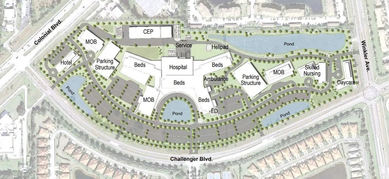 The Lee Health Fort Myers campus will harness several resilient design elements, such as raising critical infrastructure and parking areas to mitigate the effects of hurricanes or flooding. Redundant electrical systems, a full-facility generator, and multiple wells will ensure continuous operations in the event of community infrastructure disruption.
