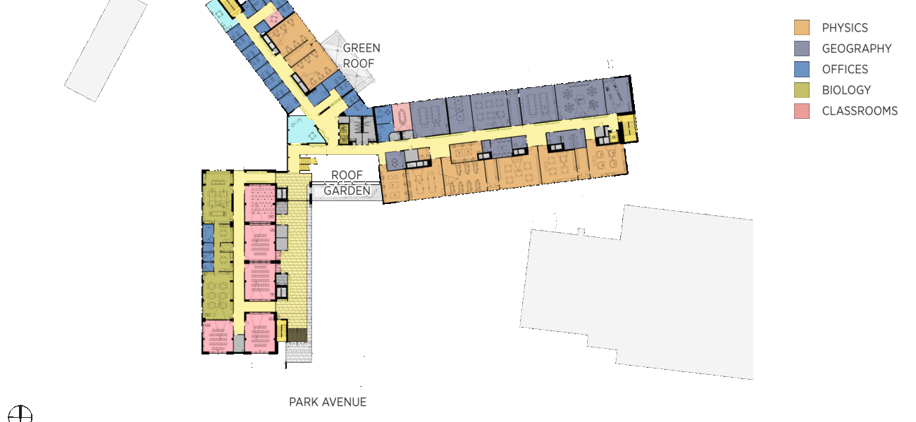 The new integrated and expanded facilities for teaching and research strengthen the University’s undergraduate science program by providing students with opportunities for experiential learning and undergraduate research. The programs are not layered by floor; instead, the disciplines are brought together with multiple departmental programs represented on each level. At the convergence of the three wings are informal, two-story, student resource spaces packed with amenities, fostering cross-disciplinary collaboration among students and faculty.