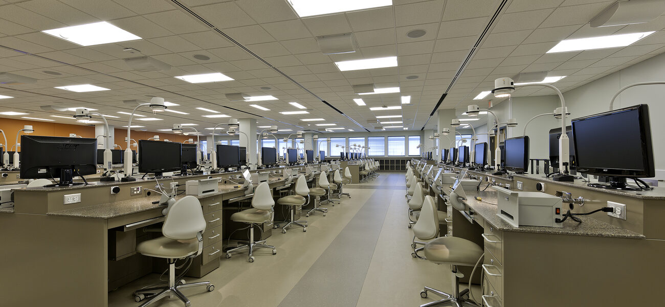 Patient care areas include a diagnostic center with a radiography suite; a special patient clinic; a fourth-year/dental hygiene clinic; and specialty clinics for oral and maxillofacial surgery, orthodontics and pediatric dentistry; as well as undergraduate and graduate clinics for endodontics, prosthodontics, and periodontics, and a faculty practice clinic. The third floor houses the clinical, simulation, and pre-clinical labs that support both the clinical and education components, the student center, and central sterilization. The preclinical/multipurpose spaces include 100-plus-seat classrooms and lab benches with state-of-the-art audio/visual equipment. The simulation lab incorporates custom-designed stations with cutting-edge simulation and audiovisual equipment, allowing students to use simulation mannequins and virtual patients. Students also can observe various procedures through video cameras and other media.