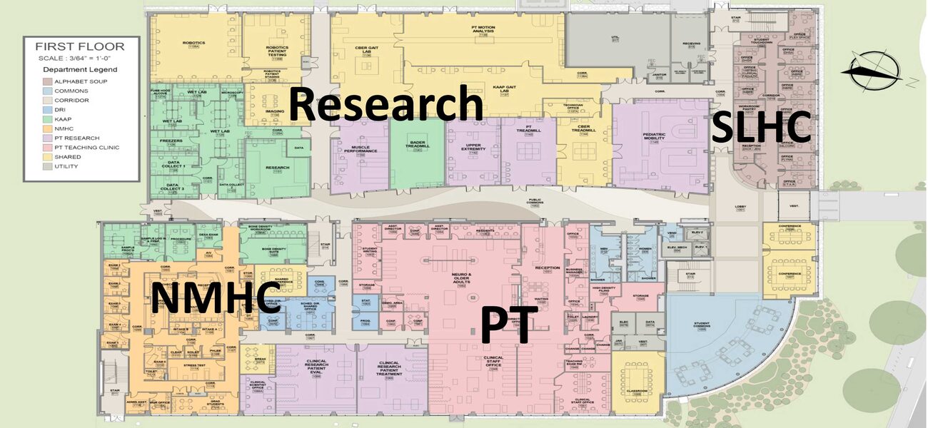 The first 100,000-sf portion of the building is designed with research labs down one side, and the clinics—physical therapy, the nurse-managed health center, and the speech language hearing center—down the other. These clinical spaces are situated so that the public can see the work going on in the laboratories, across what is called the “Translation Hallway.” Students, faculty, and post-docs conducting research in the laboratories can see and be inspired by patients and families who come into the clinics. In addition to inviting the public into the clinics, a goal of the campus is to feature walking and biking paths that are also available to the community.