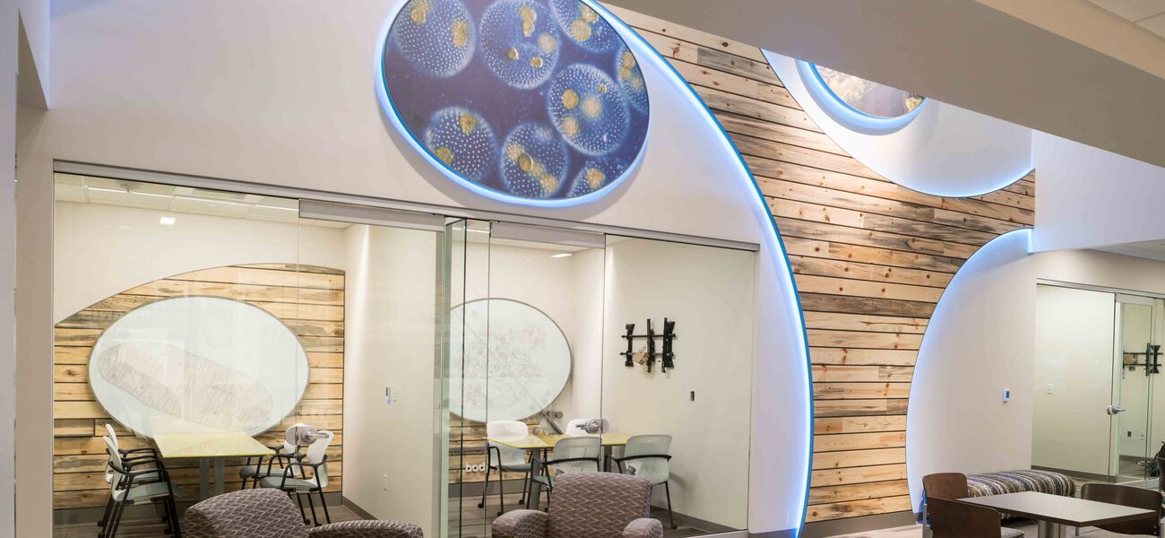 The four-story biology building, which opened in fall 2017, is organized by floor according to scientific disciplines. In addition to classrooms, student seating areas, and study rooms, the first floor features a natural history museum-like exhibit. Science-themed displays line the corridors, presenting information that can be used for instruction. Classrooms and teaching labs are also designed for maximum flexibility, with tables that double as writing surfaces and wheeled furniture that allows for rooms to be quickly reconfigured based on need.