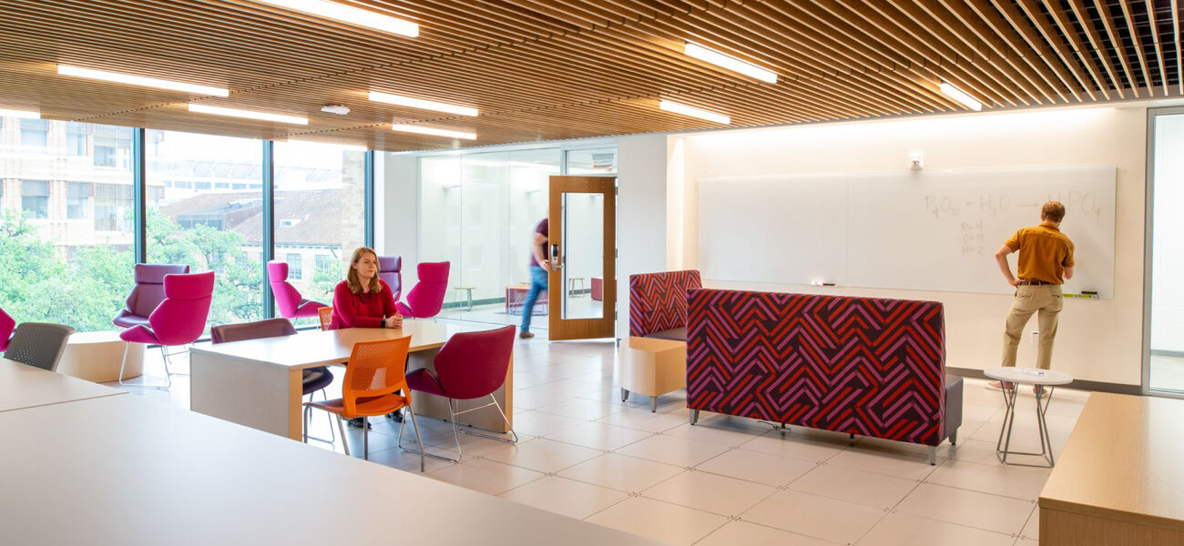 The building contained many steeply-tiered general-purpose lecture halls with capacities of 300-500 students. Some of them were refurbished with new HVAC and lighting, while others were transformed into collaborative tiered classrooms and flat-floor active learning classrooms. The active learning classrooms are provided with glass marker boards, projectors, and screens on walls, allowing for significant flexibility in use and layout. While the classroom seating capacity overall decreased from 1,805 to 1,451, the new classroom spaces better support the experiential learning pedagogy that is a hallmark of the College of Natural Sciences.