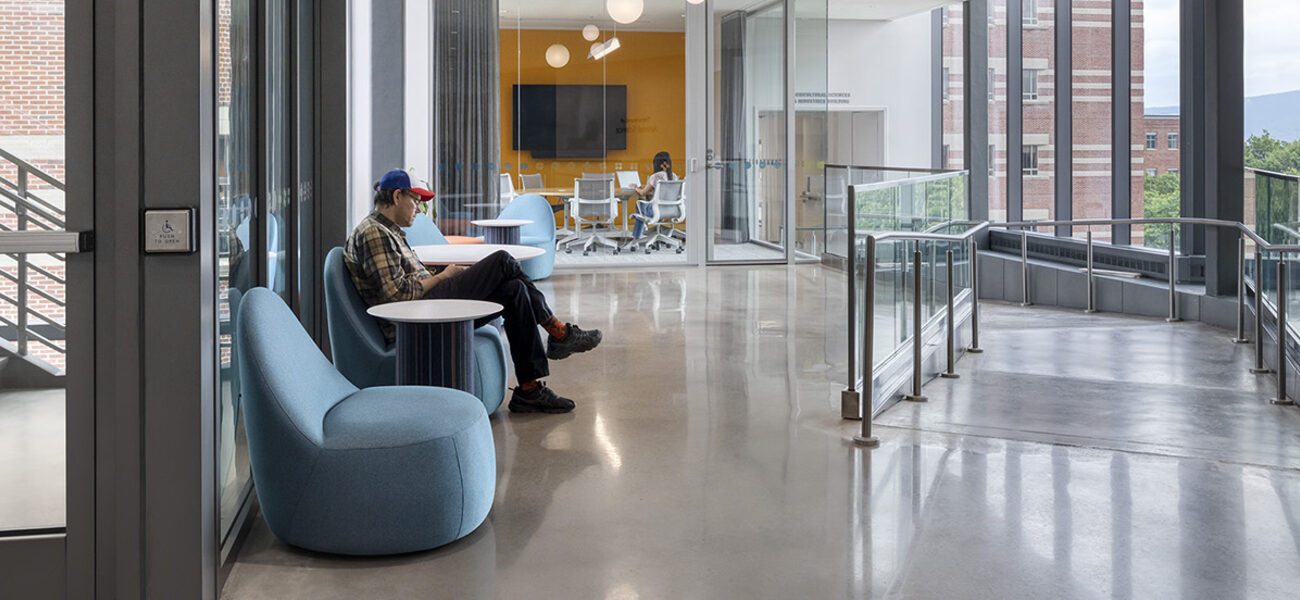 An open lobby offers work and gathering space with lots of natural light let in by floor-to-ceiling glass. The building also features a 48-seat seminar room and, on the first floor, a 100-seat classroom named for alumnus and adjunct professor Fred Metzger Jr., DVM, and his wife, Megan, whose major gift made the building possible. Upper floors house administrative offices, modular desks for graduate students, and amenities such as break rooms and kitchens.